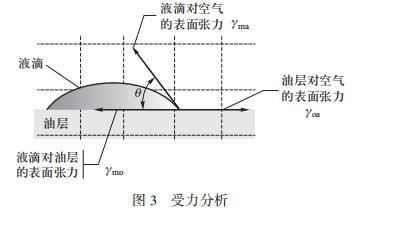 液滴爆炸現象的第二階段邊緣處的液滴產生液滴噴發現象,在該過程中液滴中部較厚的部分不斷向邊緣輸送液體,因此會穩定持續一段時間。為解釋這一階段,先從表麵張力入手,因為接觸角的不同,水對油的表麵張力大於乙醇對油的表麵張力,則混合液體對油層的界麵張力介於水和乙醇之間。混合液滴中乙醇的比例越大,混合液體對油層的界麵張力越小,受到向內的張力減小,這樣整體向外的張力增大,這是產生向外推動的驅動力的重要原因。可見界麵張力直接決定了液滴在界麵上的擴散和運動。