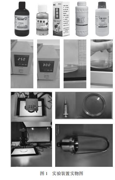 為了還原物理現象,初步探究液滴爆炸的原因,本文首先進行了預實驗。實驗中所用到的物品包括:醫用75%酒精和蒸餾水混合形成水混合物液滴,家用菜籽油用作油池,普通藍墨水染色。在室溫環境下進行實驗,預實驗中發現普通藍墨水染色現象不明顯,改進為采用甲基藍染色劑進行染色。正式實驗時準備了不同種類的水混合物(乙醇、二乙二醇丁醚),不同種類的疏水性物質(矽油、花生油、蓖麻油),不同厚度的疏水性物質(5 mm、10 mm),設置合適的濃度梯度,采用恒溫水浴鍋來測定溫度。在顯微鏡下觀察液滴的運動過程,精準測定液滴大小,利用注射器定量控製滴入液滴的體積,再利用黏度計測量黏性係數,並對實驗誤差進行了修正。