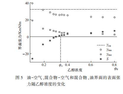 圖5油~空氣、混合物~空氣和混合物、油界麵的表麵張力隨乙醇濃度的變化