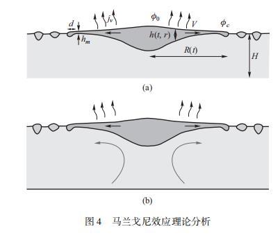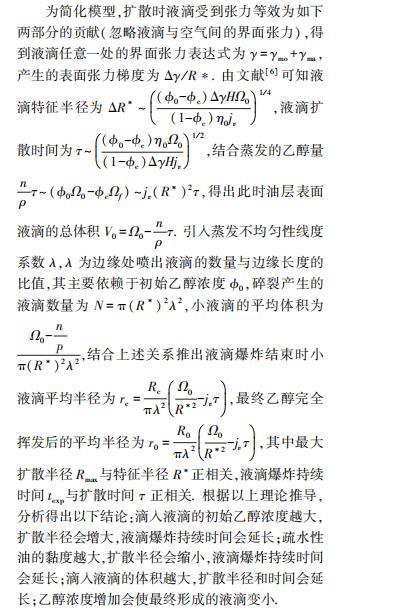 馬蘭戈尼效應是指由於表麵張力不同的二種液體的界麵存在表麵張力梯度而使質量傳送的現象。出現馬蘭戈尼效應的原因是表麵張力大的液體對其周圍表麵張力小的液體的拉力強,產生表麵張力梯度;使液體從表麵張力低的方向向表麵張力高的方向流動。此時引入馬蘭戈尼效應,就是對前文所說理論的一個形象簡潔的概括。當酒精濃度超過某一閾值,液滴擴散。酒精蒸發液滴外圍較薄的區域變得富含水,當外圍局部濃度小於閾值,擴散停止。空間上不均勻的混合物濃度產生沿液滴半徑的表麵張力梯度,它們將溶質從油滴中心向外驅動。蒸發優先消耗位於邊緣附近的液滴最薄部分的酒精,而乙醇含量的變化導致朝向液滴邊緣的界麵張力增加。這些梯度會在混合空氣和混合油界麵處產生馬蘭戈尼切向應力,從而驅動從液滴中心到外圍的徑向流動。液滴邊緣脫濕和向外的馬蘭戈尼流動效應的結合導致液滴的外圍形成較厚的邊緣,從而變得不穩定,分裂成無數的小液滴,產生液滴爆炸的物理現象。馬蘭戈尼效應示意圖如圖4所示,黑箭頭代表蒸發量和厚度的徑向減小,灰色箭頭代表液滴中馬蘭戈尼應力與油層中的黏性應力平衡,導致大量流動。h(r,t)是液滴的厚度剖麵,R(t)是中心液滴的半徑,H是油麵厚度。