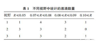 實驗三探究影響最終液滴大小的參數,這裏以75%乙醇濃度為例,說明測量碎裂液滴大小的方法。觀察多個視野,將視野內的液滴劃分為四類,顯微鏡下觀察到的液滴通過三點共圓確定液滴半徑,並測出各自半徑R(單位mm)隨機選取中部3個麵積相同(A=πr2=2 mm2)的典型視野,統計各個視野中不同大小的液滴數量。最終加權求平均得到R平均=0.0743 mm=74.3μm.