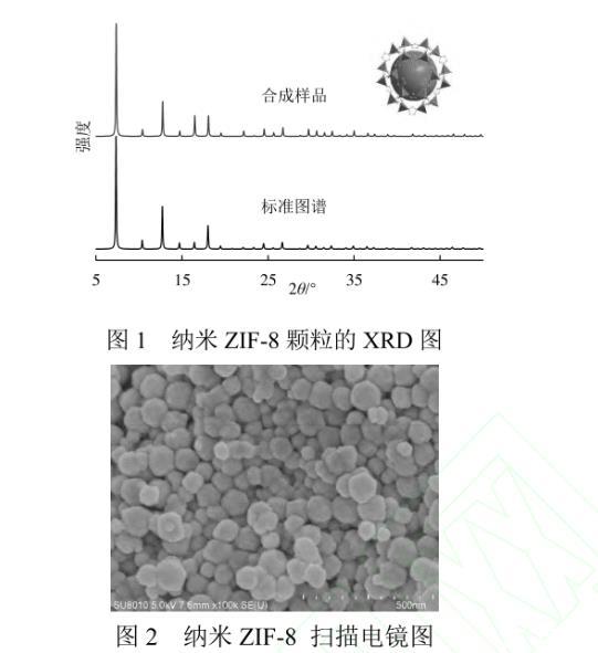 納米ZIF-8顆粒的XRD譜圖如圖1所示。合成的樣品譜圖分布與標準譜圖匹配,且所獲得的衍射峰與文獻吻合,未出現雜峰,表明製備的樣品具有單一相且結晶度良好。由謝樂公式計算得到晶粒尺寸約為70 nm。由納米ZIF-8顆粒的掃描電鏡照片可見,ZIF-8顆粒形貌為六邊形,平均尺寸為65.8 nm,與XRD計算結果一致。