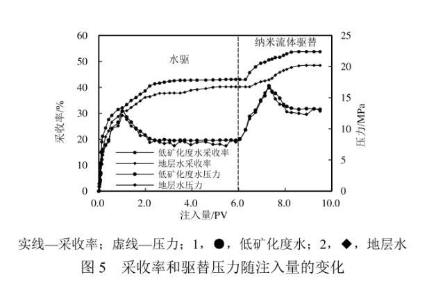 在驅油機理實驗探究的基礎上,優選納米ZIF-8顆粒質量分數為0.03%的納米流體進行岩心驅替實驗。采收率及驅替壓力隨注入體積的變化如圖5所示。使用模擬地層水、低礦化度水首次驅替至無油產出時的采收率分別為40.24%、43.06%。轉注含納米ZIF-8顆粒的流體後,受益於岩石表麵潤濕性向著更加水濕轉變以及油水間界麵張力的降低,油滴更易被剝落,且在流動過程中更易被注入液包裹形成乳狀液,增強了微觀驅替效率,從而使得最終采收率分別提高了8.25百分點和10.71百分點。注入納米流體後,驅替壓力得到了一定的提升。這可能是由於納米顆粒堵住了部分高滲通道,流體向孔滲條件較差的小孔隙流動,從而提高了波及效率,在一定程度上也有助於采收率的提高。
