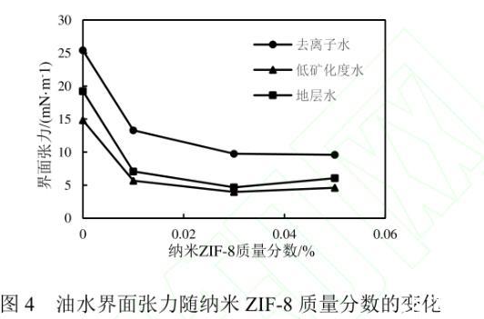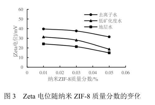 納米ZIF-8流體的穩定性是評價其能否作為驅油劑的重要性質之一。將裝有不同濃度納米流體的樣品瓶靜置15 d後,當ZIF-8的質量分數為0.01%、0.03%時,納米顆粒在不同礦化度的流體中均保持穩定狀態,無沉澱生成,說明適當濃度的納米ZIF-8顆粒在水中有著良好的穩定性。當ZIF-8的質量分數為0.05%時,靜置後的納米流體產生了少量沉澱,表明過高濃度的ZIF-8會互相聚結,導致顆粒變大,進而發生聚沉。