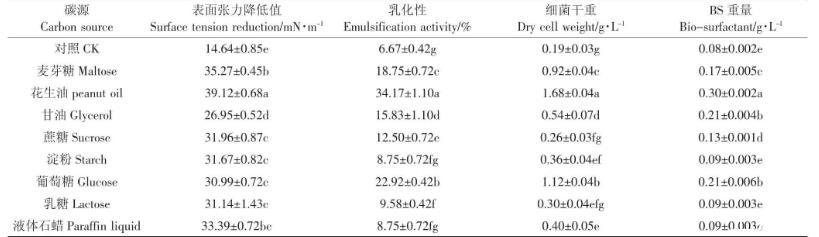 碳源對細菌的生長與發酵產物量有重要影響。銅綠假單胞菌(Pseudomonas aeruginosa)可在多種類型碳源下產生生物表麵活性劑,包括甘油、乙醇、植物油等。由表3可知,以花生油為碳源,細菌發酵液的降低值為39.12 mN·m-1,明顯高於其他碳源類型;乳化值為34.17%,稍高於其他碳源,此時細菌生物量最大,糖脂含量最高,為0.30 g·L-1。雖然花生油作為碳源,能夠促進菌株產生更多生物表麵活性劑,但如果用於實際生產,成本相對較高,近年來一些研究者嚐試使用成本較低的工業副產物如糖蜜、廢潤滑油等作為碳源,發現也具有很好的促進微生物產生生物表麵活性劑的作用。因此,後期會考慮選擇用一些低成本碳源進行發酵。