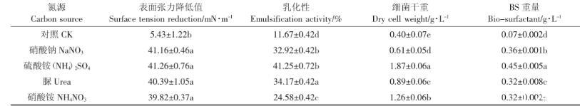 細胞表麵的物質合成需要氮源,氮源的種類會對細菌細胞的生長和發酵產物的產量產生很大影響。由表4可以看出,不同氮源對細菌發酵過程中表麵張力降低值的影響較小,可能與發酵液中的生物表麵活性劑含量已經達臨界膠束濃度(CMC)有關。當氮源為硫酸銨時發酵液表麵張力降低值最大,同時乳化性、細菌幹重、糖脂含量均達到最大值。這與錢曉勇等研究結果一致,硫酸銨是促進生物表麵活性劑生成的較好氮源。
