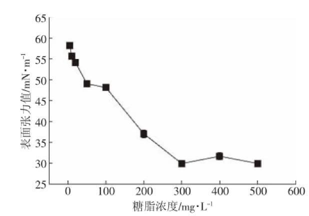 發酵產物臨界膠束濃度是指分子在溶劑中締合形成膠束的最低濃度。臨界膠束濃度(Critical micelle0.005 concentration,CMC)可以作為表麵活性劑表麵活性的一種度量,CMC越小,改變表/界麵性質,起到增溶、乳化等所需的濃度就越低。從圖3可以看出:糖脂在0~300 mg·L-1時,表麵張力值隨著糖脂濃度的升高而降低,且在300 mg·L-1時達到最小值;在300~500 mg·L-1時,表麵張力值變化不大。可得發酵粗提產物的CMC為300 mg·L-1,明顯低於普通化學表麵活性劑十二烷基磺酸鈉(SDS)的2200 mg·L-1,能在較低濃度下使用,因而在醫藥、食品、化工等行業具有廣闊應用前景。