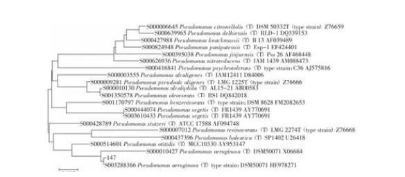 觀察菌株培養特征及形態特征,可見菌體細長且長短不一,菌落較小,為扁平、濕潤的菌落。部分生理生化指標如表2。經16S rDNA測試並與GenBank中已登錄的核苷酸序列號進行同源性比較,發現菌株147與Pseudomonas aeruginosa DSM50071同源性為99%,采用MEGA 5.10軟件NJ方法構建147的16S rDNA係統發育樹見圖1。結合生理生化特征結果,將菌株147鑒定為銅綠假單胞菌(Pseudomonas aeruginosa),該菌株GenBank登錄號為KU921686。