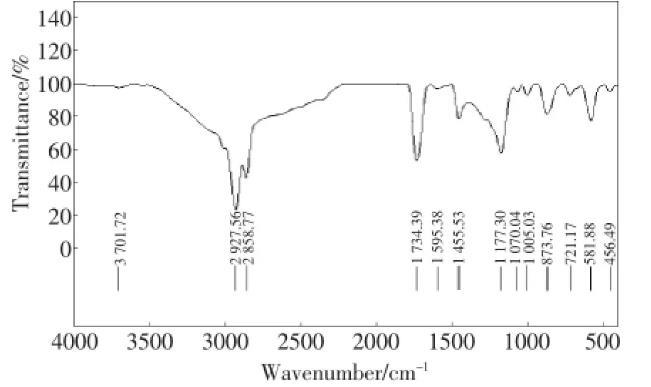 將菌株147產物提純,紅外光譜儀(FT-IR)分析物質結構,結果如圖2。該物質在3701.72cm-1處有吸收峰,表明分子中有羥基存在;2 858.77~2 927.56 cm-1處的吸收峰表明存在糖類C-H的伸縮振動,1400~1200 cm-1處是C-H變角振動,1 734.39 cm-1處是C=O的雙鍵振動,而1 070.04 cm-1處為C-O-C鍵伸縮振動,因此該物質中有一個五元環狀內酯和糖苷鍵存在。由此進一步證明該生物表麵活性劑含糖脂類物質。