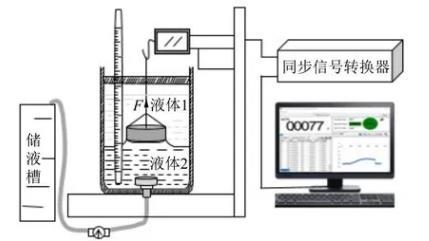 圖1為自製2種液體間界麵張力的動態實時測量裝置圖,該儀器主要包括電腦顯示器、同步信號轉換器、自製實驗架台、力敏傳感器、金屬吊環、恒溫杯、溫度計、排液孔、排液管、流速調節器和儲液槽等組成.