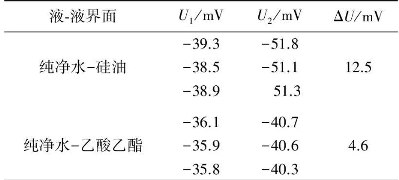 實驗測量所用金屬吊環的外徑、內徑分別為0.034 96 m和0.033 10 m.在20℃實驗條件下,采用自製2種液體間界麵張力的動態實時測量儀,測量了純淨水-矽油和純淨水-乙酸乙酯間的界麵張力.測量出金屬吊環由液體I中完全進入液體Ⅱ的過程中,液體I的液膜被拉斷前電壓的最大值U1,拉斷後趨於穩定時的電壓值為U2,數據結果如表1所示.