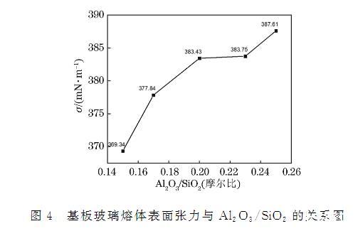 圖4 基板玻璃熔體表麵張力與Al₂O₃/SiO₂的關係圖