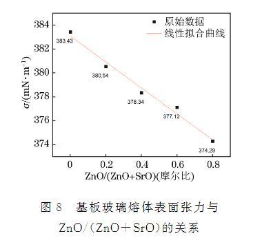 圖8 基板玻璃熔體表麵張力與ZnO/(ZnO+SrO)的關係