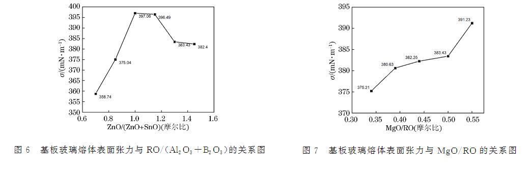 圖6 基板玻璃熔體表麵張力與RO/(Al₂O₃+B₂O₃)的關係圖