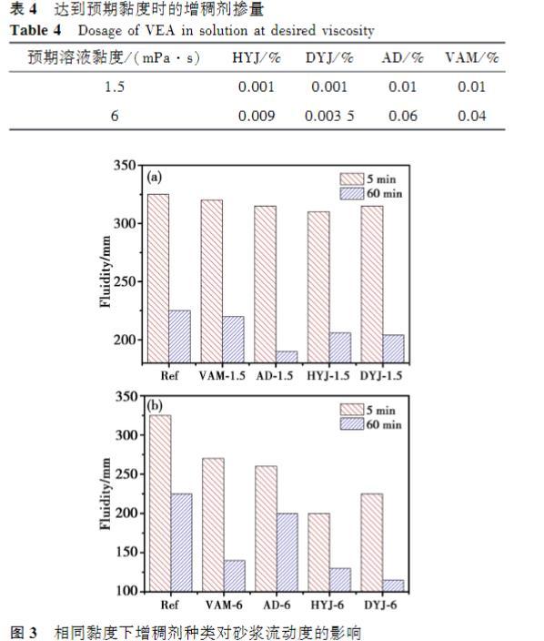 增稠劑溶液的黏度越高,砂漿的流動度越低。在較低黏度下,四種增稠劑對砂漿初始流動度的影響接近,60min時,AD的經時流動度最低,VAM流動度相對於基準砂漿略微下降;然而當溶液黏度提高至6mPa·s時,摻入HYJ和DYJ的砂漿流動度顯著低於AD和VAM,60min後的損失也更大,AD的經時流動度略低於基準砂漿。