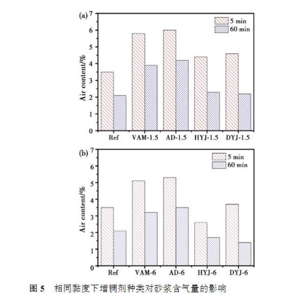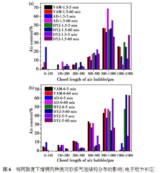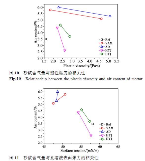 當溶液黏度為1.5mPa·s時,VAM和AD的摻入使砂漿初始含氣量相對於基準砂漿增大66%和71%,而HYJ和DYJ僅使初始含氣量提高26%和31%;當溶液黏度為6mPa·s時,VAM和AD的摻入使砂漿初始含氣量相對於基準砂漿增大46%和51%,而DYJ僅使初始含氣量提高6%,HYJ則降低含氣量26%.
