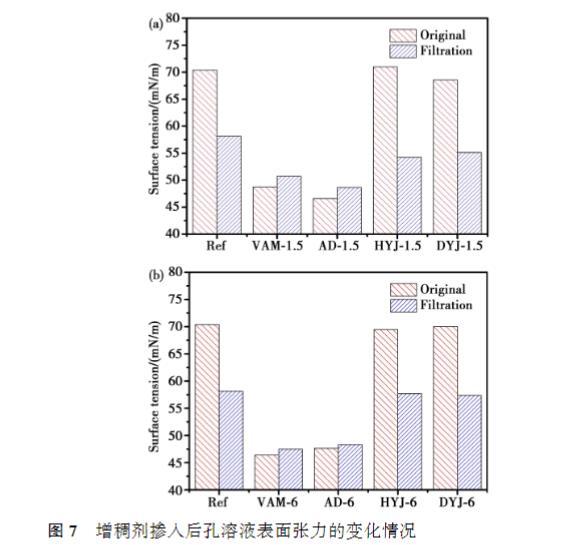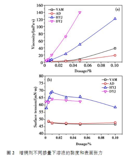 相同摻量下,DYJ的黏度最高,其次是HYJ,VAM和AD黏度在低摻量下接近,摻量達到0.10%之後,VAM黏度高於AD;VAM和AD的黏度隨著摻量的提高緩慢增大,而HYJ和DYJ溶液的黏度隨摻量的提高迅速提高,尤其是DYJ的增長幅度更為顯著。總體來看,增稠劑分子量越大,相同摻量時溶液的黏度越高。從表麵張力的結果來看,相同摻量下,HYJ溶液的表麵張力最高,其次是DYJ,VAM和AD的表麵張力顯著低於其他兩種增稠劑,且AD略微高於VAM.