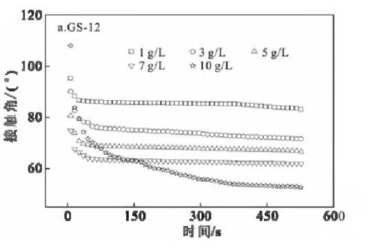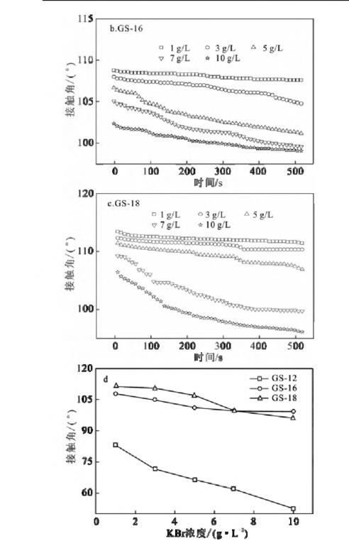 在KBr濃度區間1~10 g/L內,GS-12隨著KBr濃度的增加,接觸角顯著減小,而GS-16和GS-18則變化不明顯。可以解釋為:對於GS-12而言,KBr濃度越高,固/液界麵處的填料越緊密,導致氣/液固界麵張力值降低,而疏水鏈較長的GS-16和GS-18其自身降低界麵張力的能力有限,所以,隨KBr濃度增加,接觸角變化有限[1,19]。此外,隨著KBr濃度的增加,液滴在石蠟膜上的接觸角值減小。