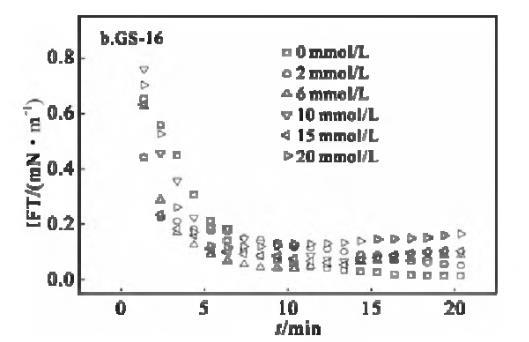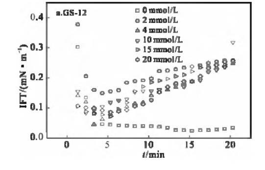 表麵活性劑/油體係的動態界麵張力行為,對驅油過程具有重要意義。動態界麵張力是驅油過程中各種複雜物理化學反應的具體體現。因此,研究動態界麵增長力及其影響因素非常重要。溶液中離子強度增加,將影響表麵活性劑分子在水相中的溶解度,改變雙電層參量,而導致油水界麵表麵活性劑濃度的改變。一般情況下,添加的鹽可以通過中和表麵活性劑分子在界麵上頭基的電荷來減弱表麵活性劑分子之間的靜電斥力,導致IFT降低[5]。溫度為30℃下,不同KBr鹽濃度下,GS-12,GS-16的煤油/表麵活性劑溶液界麵張力隨時間的變化曲線見圖6。