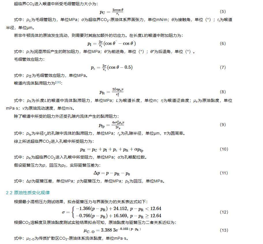 由於各個油藏的實際情況存在差異,因此該模型應用的過程中需要結合油藏最小混相壓力、喉道尺寸分布公式、驅替壓力與界麵張力的關係表達式、原油黏度與驅替壓力的關係表達式等。