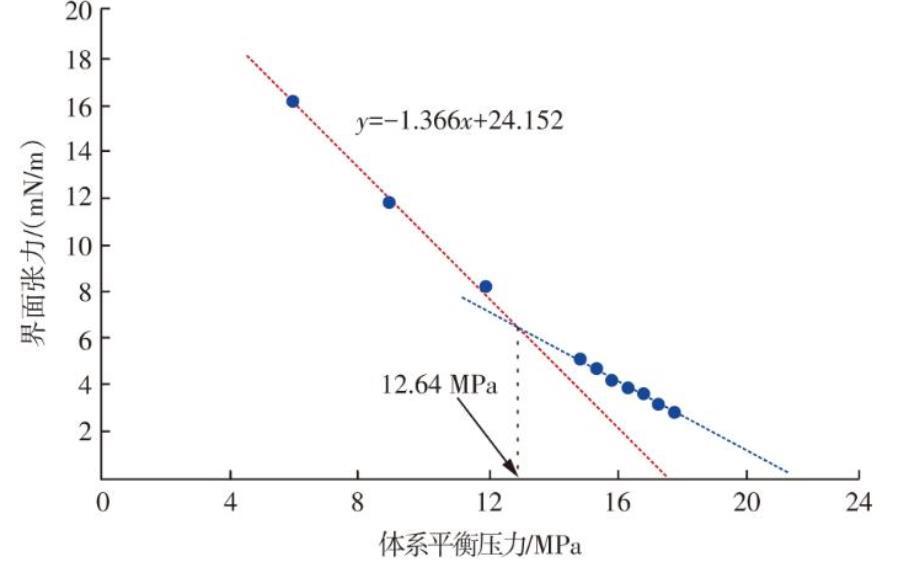 如圖2所示,懸滴法測試結果表明:當體係平衡壓力<12.64 MPa時,界麵張力隨體係平衡壓力的增大而快速減小,其線性擬合的直線與X軸交點位於17.56 MPa,該體係平衡壓力為多級接觸最小混相壓力;當體係平衡壓力≥12.64 MPa時,界麵張力減小幅度變緩,線性擬合的直線與X軸交點位於21.63 MPa,代表了CO2與原油一次接觸最小混相壓力。