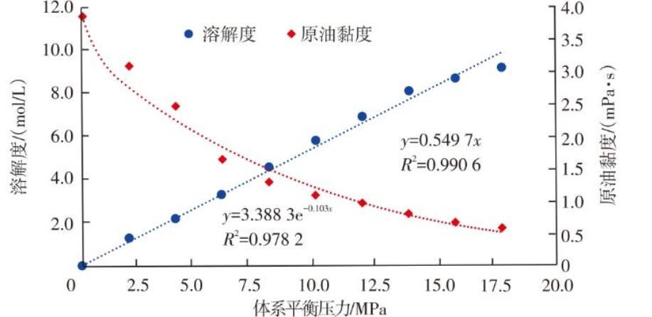 實驗測定60℃和不同壓力條件下CO2溶解度及原油黏度的變化特征。如圖1所示,CO2溶解度與體係平衡壓力呈近似線性關係,原油黏度與體係平衡壓力呈近似指數關係。初始狀態下,原油黏度為3.98 mPa·s,但當體係平衡壓力上升到18 MPa時,原油黏度降低至0.59 mPa·s。