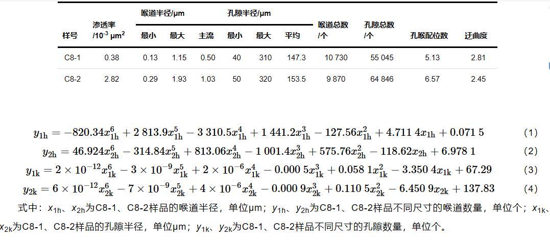 式中:x1h、x2h為C8-1、C8-2樣品的喉道半徑,單位μm;y1h、y2h為C8-1、C8-2樣品不同尺寸的喉道數量,單位個;x1k、x2k為C8-1、C8-2樣品的孔隙半徑,單位μm;y1k、y2k為C8-1、C8-2樣品不同尺寸的孔隙數量,單位個。