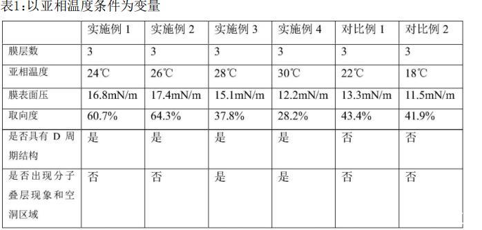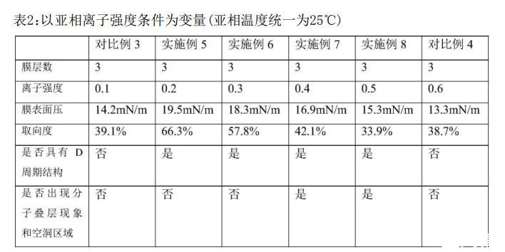 •對比實驗:亞相溫度過高(>30°C)或離子強度過低(<0.2)會導致纖維排列混亂(對比例1–4),超純水亞相則無法形成D周期結構(對比例5)。