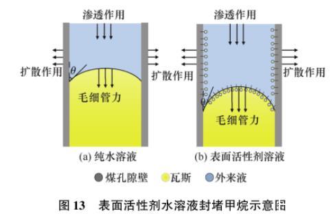 毛細管力與溶液表麵張力成正比、與孔隙半徑成反比;同時,接觸角越小,毛細管力越大。由表5可知,朱鍇[21]試驗並計算煤樣10 nm孔徑的毛細力,發現自配的表麵活性劑水溶液能夠使毛細力平均提高2倍,最大提高4.03倍。如圖13所示,在擴散、滲透和毛細力共同作用下,表麵活性劑水溶液沿著煤體表麵、孔隙和裂隙進入煤體內部產生液相滯留效應,增大煤潤濕效果的同時其內部瓦斯流動阻力變大,孔隙內瓦斯氣體被水溶液封堵。因此,添加活性劑水溶液能夠減小水溶液的表麵張力、降低水溶液與煤之間的接觸角,增強煤的潤濕效果,達到抑製煤層瓦斯的解吸、延緩采動煤岩體中瓦斯逸散的目的,從而降低開采工作麵瞬時瓦斯湧出量。也有學者[21,29,32]分析認為,添加表麵活性劑水溶液會降低煤體溫度、增強煤吸附瓦斯的能力,使得部分遊離態瓦斯轉變為吸附態,相應地減少了瓦斯氣體的逸散湧出。