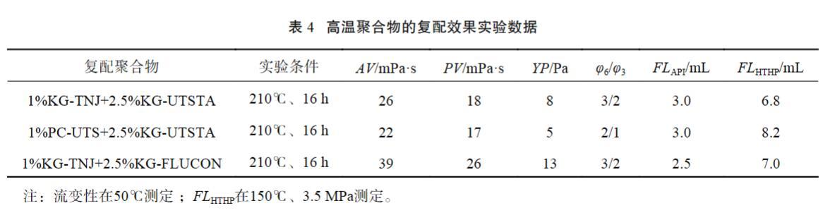 室內以濾失改善效果較好的1%DrilFILHT為基礎,考察增黏劑KG-TNJ、PC-UTS與2種抗超高溫改性澱粉的複配效果,選定材料最佳組合。評價配方:基礎配方+1.0%DrilFILHT+複配聚合物,實驗結果見表4。
