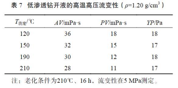 表7低滲透鑽開液的高溫高壓流變性(ρ=1.20 g/cm3)