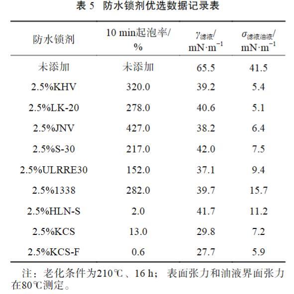 前期鑽井作業期間,鑽開儲層前低滲透鑽開液體係中加入了防水鎖劑材料,發現加入後出現了起泡問題,加入消泡劑後有一定效果但是循環和再加入防水鎖劑時又會出現起泡情況,一定程度上影響了正常作業。另外,由於起泡問題,會將空氣中氧氣攜帶進入鑽井液中,在井底高溫環境中會加速鑽井液中聚合物材料的降解。為了解決起泡問題,同時預防低孔低滲儲層的水鎖傷害,室內開展超高溫低滲透鑽開液體係配套防水鎖劑優選試驗。