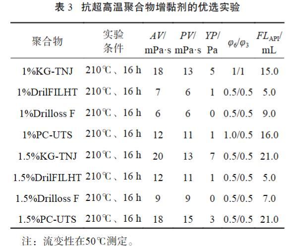 室內對4種高溫聚合物增黏劑材料進行了單劑抗溫性能對比評價。其中KG-TNJ為溫敏疏水締和聚合物提黏劑,DrilFILHT為納米片狀氧化鎂酚醛樹脂改性聚合物增黏降濾失劑材料,Drilloss F為納米微球聚合物複合增黏聚合物材料,PC-UTS為某國外代表性高溫聚合物材料。評價配方:基礎配方+2.5%KG-UTSTA+聚合物,實驗結果見表3。