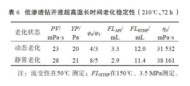 表6低滲透鑽開液超高溫長時間老化穩定性(210℃、72 h)