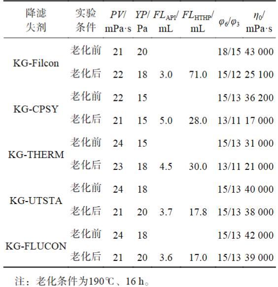 為避免超高溫下材料間的相互影響幹擾判斷,室內在190℃下先固定KG-TNJ作為增黏劑材料不變,對5種改性澱粉類高溫降濾失劑材料進行了初選。其中,KG-Filcon為海上常用抗高溫改性澱粉;KG-CPSY和KG-THERM均為聚合物接枝改性抗高溫澱粉;KG-UTSTA和KG-FLUCON均為室內使用2-丙烯酰胺基-2-甲基丙磺酸AMPS、聚苯乙烯乳液與可溶性澱粉在堿性條件下通過接枝共聚生成抗超高溫改性澱粉,2者區別在於KG-UTSTA為機械攪拌條件下共聚合成,KG-FLUCON為超聲波機械協同方式混勻後再進行合成。評價配方:基礎配方+1.0%KG-TNJ+2.5%降濾失劑,實驗結果見表2。由表2可知,190℃老化後,各體係的流變性能穩定,KG-UTSTA和KG-FLUCON體係的高溫高壓降濾失性最好,濾失量小於20 mL,KG-CPSY和KG-THERM體係的高溫高壓降濾失性能次之。分析原因為改性澱粉都引入了抗高溫接枝共聚單體,但是KG-FLUCON、KG-UTSTA除了引入AMPS類抗高溫單體外,還引入聚苯乙烯乳液,增加了接枝改性的抗高溫基團和空間結構,通過聚苯乙烯乳液組分的吸附、滲透、覆蓋包裹特性增強了對澱粉結構的高溫保護作用和產物的成膜封堵性能,改善了其抗高溫性和濾失造壁。