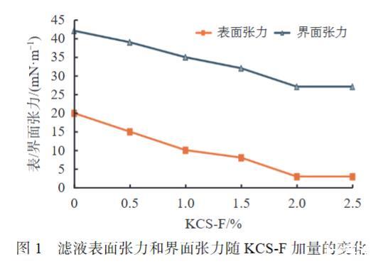 圖1濾液表麵張力和界麵張力隨KCS-F加量的變化