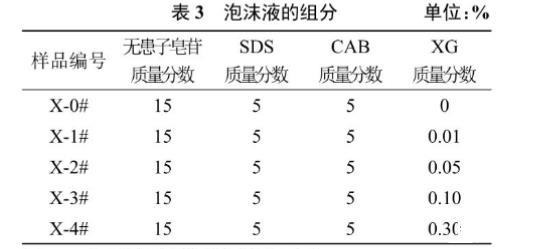 表3為泡沫溶液的配方。根據三元複配體係的發泡性能,選取發泡性能最佳的9號組,無患子皂苷、SDS、CAB質量分數固定在15%、5%、5%。研究XG濃度變化對泡沫溶液性能的影響。
