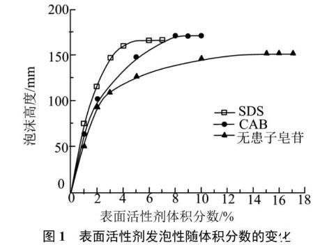 如圖1所示,3種表麵活性劑發泡性能隨濃度增加而增大,都經過了快速增長階段、緩慢增長階段,最後發泡高度趨於平穩,不再隨濃度增加而變化。SDS、CAB、無患子皂苷質量分數分別在5%、8%、15%時初始泡沫高度達到了最高值,分別是166 mm、171 mm、152 mm。形成大量泡沫的關鍵因素是表麵流動性[8],以上結果表明CAB具有更好的表麵流動性。