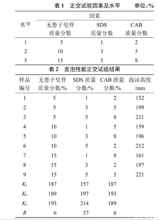 以發泡體係的複配組分(無患子皂苷、SDS、CAB 3種表麵活性劑)為考察的3個因素,根據3種表麵活性劑的發泡性能,每個因素選3個水平,選用L9(33)正交試驗設計優化泡沫滅火劑的配方,正交表設計如表1所示。