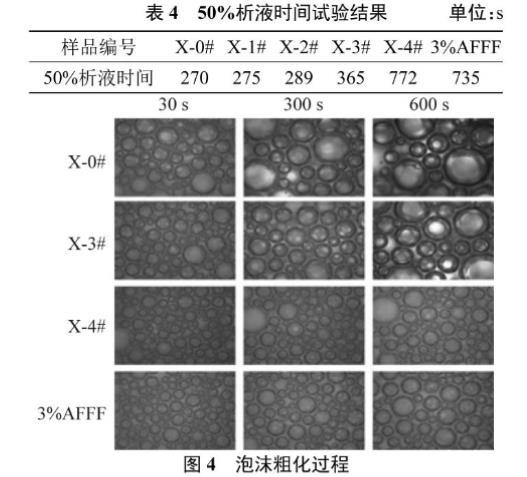 泡沫的穩定性主要由泡沫的排水、粗化和聚並等多因素決定[10]。雙注射器技術產生的6種泡沫的圖像見圖3,而6種泡沫的50%析液時間測定結果見表4。這6種泡沫在0 s時有相同的初始體積,在重力作用下發生泡沫排水現象,600 s後6種泡沫的排水體積之間存在很大的差異,X-0#、X-1#和X-2#樣品泡沫排水量幾乎達到發泡前泡沫溶液的初始體積,X-3#泡沫排水量明顯降低,X-4#泡沫的排水體積較3%AFFF的排水體積少。以上結果表明添加質量分數0.30%的XG能很好地減緩泡沫排水,使無氟泡沫和商用泡沫滅火劑有相當的泡沫穩定性。