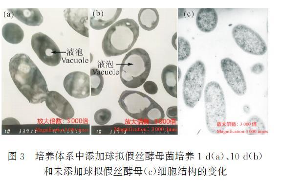圖3培養體係中添加球擬假絲酵母菌培養1d(a)、10d(b)和未添加球擬假絲酵母(c)細胞結構的變化