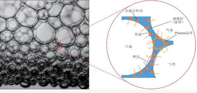 泡沫是一種熱力學不穩定的膠體體係,其中氣體分散在表麵活性劑穩定的連續液相中,可以自發破裂。圖1顯示由表麵活性劑形成的典型泡沫結構。提高CO2泡沫的穩定性具有挑戰性,因為在高壓儲層條件下,CO2更易溶於水,溶解的CO2會引起泡沫的團聚。