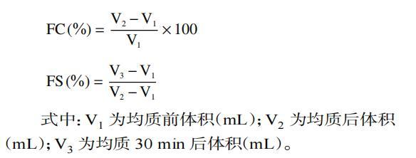 式中:V1為均質前體積(mL);V2為均質後體積(mL);V3為均質30 min後體積(mL)。