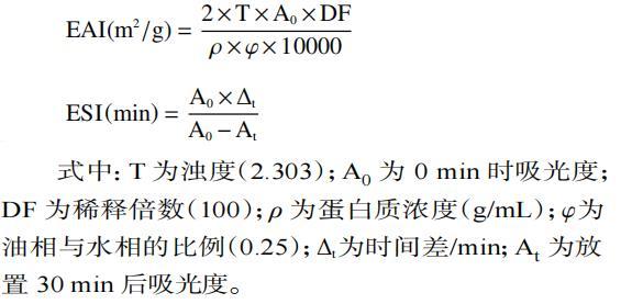 蛋清蛋白的乳化活性指數(emulsifying ability index,EAI)和乳化穩定性(emulsifying stability index,ESI)測定。製備不同pH(2.0、4.0、6.0、8.0、10.0)含1%(w/v)蛋清蛋白的溶液,取15 mL溶液與5 mL玉米油混合,在10000 r/min條件下高速均質1 min。分別在0、30 min時從離心管底部取50µL溶液,加入到4950µL 0.1%SDS溶液中,渦旋5 s混勻,立即在500 nm波長處測定吸光度。