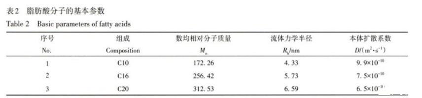 對比不同鏈長脂肪酸在不同質量濃度時的動態界麵張力(圖9A-9C),發現雖然脂肪酸在正辛烷中的擴散係數隨著碳鏈的增長而減小(表2),但添加高質量濃度C20酸時,界麵張力值到達平衡的時間明顯縮短,這表明脂肪酸烷基鏈長度會影響脂肪酸在界麵的性質。並且發現脂肪酸烷基鏈越長,與NH2-PEG-GO協同穩定的水-正辛烷界麵張力越低。並且隨著脂肪酸質量濃度增加,烷基鏈鏈長增加對界麵張力降低效果越明顯(圖9D)。