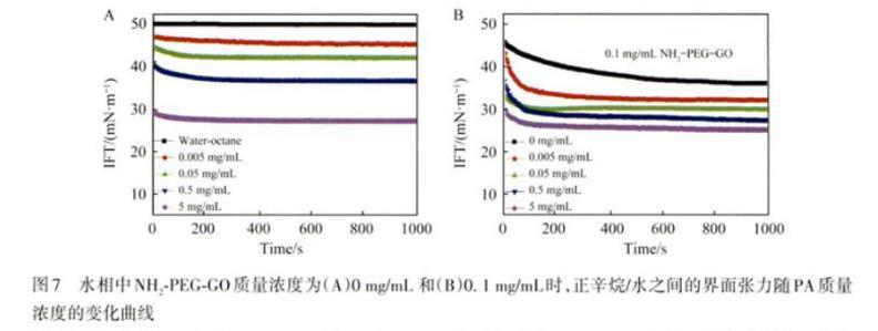固定NH2-PEG-GO質量濃度(0.1 mg/mL),分析改變正辛烷溶液中PA質量濃度時界麵張力的變化情況。動態界麵張力的演變如圖7所示,當正辛烷中PA質量濃度小於5 mg/mL時,即使加入微量的NH2-PEG-GO(0.1 mg/mL)就能夠顯著降低界麵張力,相比於不添加NH2-PEG-GO時的情況降低了約15 mN/m。然而,隨著PA質量濃度的增加(0.005~5 mg/mL),界麵張力僅從32 mN/m降低到25 mN/m(圖7B)。在不添加NH2-PEG-GO時,隨PA質量濃度增加(0.005~5 mg/L),界麵張力的下降值則約為20 mN/m(圖7A)。這表明NH2-PEG-GO的添加使得PA在界麵上吸附減少,NH2-PEG-GO成為降低界麵張力的主導因素。然而隨著PA質量濃度升高,PA的界麵吸附量逐漸達到飽和,少量NH2-PEG-GO的存在不會顯著降低界麵張力。當PA的質量濃度達到5 mg/mL時,存在0.1 mg/mL NH2-PEG-GO僅比不存在時降低了約2 mN/m,這是由於此時界麵被PA占滿,沒有足夠的空間供NH2-PEG-GO進行吸附。