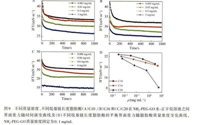 利用界麵張力儀研究氨基化氧化石墨烯(NH2-PEG-GO)質量濃度、脂肪酸質量濃度以及脂肪酸鏈長度對於NH2-PEG-GO與脂肪酸在水-油界麵共吸附動力學的影響。