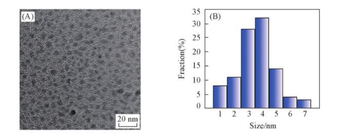 通過傅裏葉變換紅外光譜(FTIR)、透射電子顯微鏡(TEM)和X射線衍射(XRD)對DA-GQD的結構進行表征。從FTIR譜圖(圖S1,見本文支持信息)可知,DA-GQD可能包含C—H,O—H,O═C(R)—和C—N基團。從TEM和粒徑分布圖(圖2)可以看出,DA-GQD顆粒比較均勻,基本上為橢球形納米顆粒,粒徑主要分布在1~7 nm,平均粒徑約為3.5 nm。XRD譜圖(圖S2,見本文支持信息)中在20°左右有一個較寬的峰,說明合成的DA-GQD具有石墨烯結構。