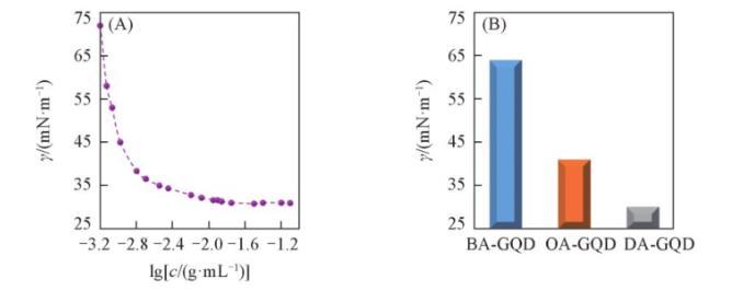 為了研究烷基鏈中碳原子數對表麵活性的影響,按照1.2.1節方法,用丁胺和辛胺代替十二胺,分別製備了丁胺功能化石墨烯量子點(BA-GQD)和辛胺功能化石墨烯量子點(OA-GQD),並測定其最低表麵張力。由圖3(B)可知,DA-GQD的表麵張力比BA-GQD和OA-GQD的表麵張力低得多,表現出更好的表麵活性。3種石墨烯量子點的主要區別在於烷基胺的碳鏈長度,結果表明,烷基碳鏈長度對石墨烯量子點的表麵活性有較大影響,烷基鏈越長,表麵活性越好。上述規律與經典的表麵化學理論一致。