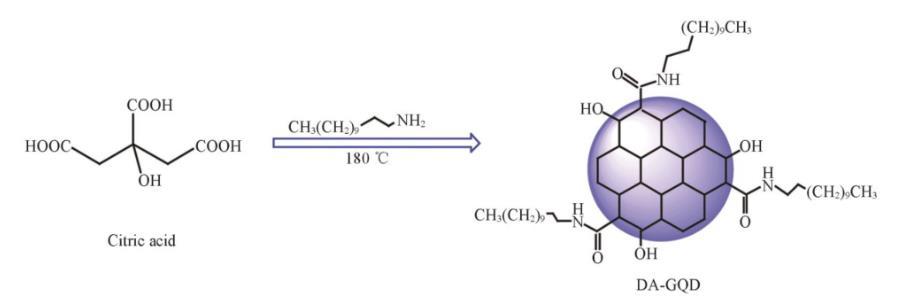 首先采用“自上而下”法,由CX-72炭黑在濃硝酸中回流24 h製備GQD。雖然能夠實現一步同時製備單層和多層GQD,但是存在反應時間長、強酸會對環境造成一定汙染等弊端。本實驗設計通過“自下而上”法,以檸檬酸為前驅體、直鏈烷基胺為功能化試劑,通過一步熱裂解製備雙親性DA-GQD(見圖1)。檸檬酸分子之間脫水縮合形成六邊形sp2碳原子鍵合的石墨烯片,十二胺通過氨基與檸檬酸上的羧基縮合,將烷基鏈引入石墨烯片的邊緣以提高疏水性。
